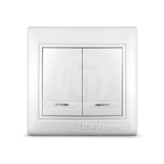 Двухклавишный выключатель с подсветкой, белый UNIVersal Севиль С0123 имеет универсальный белый пластиковый корпус с лаконичными линиями. Устройство идеально подходит для монтажа в жилых комнатах, офисных кабинетах и пр.