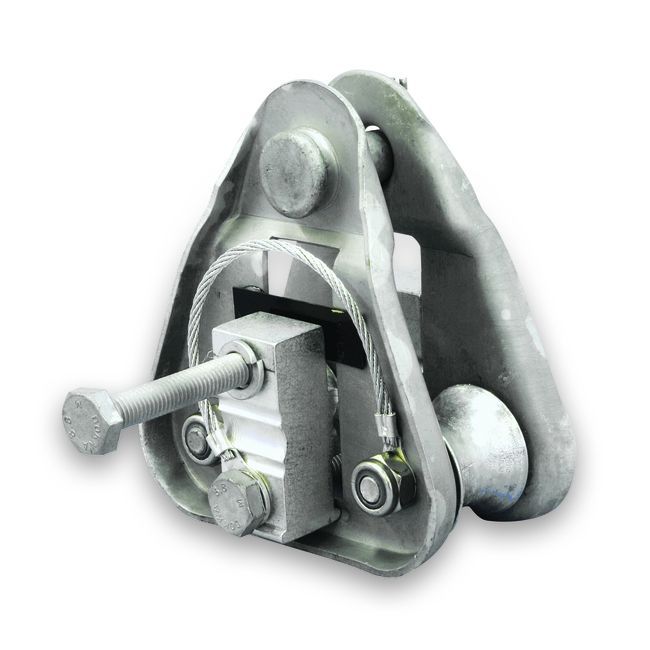 Поддерживающий зажим с раскаточными роликами для неизолированных проводов диаметром до 30 мм, сечением 35-150 мм². Провода могут быть раскатаны прямо на этих зажимах, что исключает необходимость использования отдельного монтажного ролика.