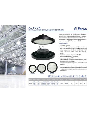 Подвесные светильники Feron серии AL1004 артикул 41202 применяются для освещения складских, торговых и производственных помещений с высокими потолками (более 4 м).