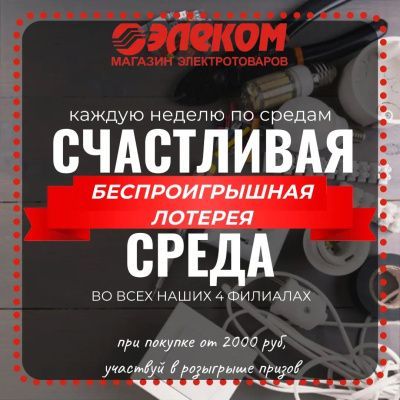 ТД "Элеком" начиная с 15 марта проводит акцию по средам "Счастливая среда". Покупатели совершившие покупки от 2000 руб. сами выбирают себе приз. Одному человеку предусмотрен только один приз. Покупателям нельзя делить покупку на несколько чеков по 2000 руб. Не упустите возможность сделать покупку и заодно выбрать себе нужный в хозяйстве приз!